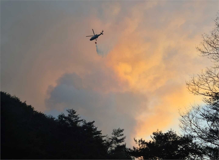 강원 인제군 기린면 산불 이틀째인 21일 68%의 진화율을 보이는 가운데 진화헬기 29대가 아침 일찍부터 투입돼 막바지 진화에 나섰다. 산림 당국에 따르면 장비 69대와 진화인력 338명을 투입해 밤사이 지상 진화에 집중했으나 산세가 험해 진화에 어려움을 겪었다.
