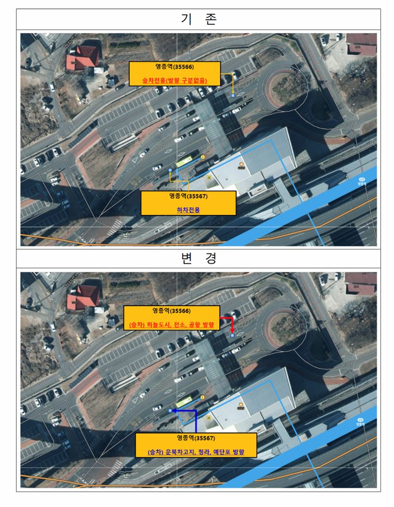 영종역 경유 전체 시내버스 노선을 분석하여 하늘도시‧전소‧공항 방향과 운북차고지‧청라‧예단포 방향으로 정류소를 분리하는 방안을 수립, 중구 등 유관기관의 의견수렴 절차를 거쳐 8. 24.(토) 첫차부터 시행할 예정이다.