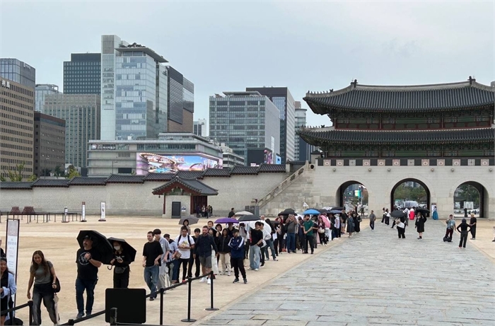 개천절인 3일 오전 서울 경복궁의 흥례문이 열리자 '첫 손님'이 들어왔다. 한국 드라마와 배우 공유를 좋아해 한국 여행에 나선 호주인 푸트리 씨였다.