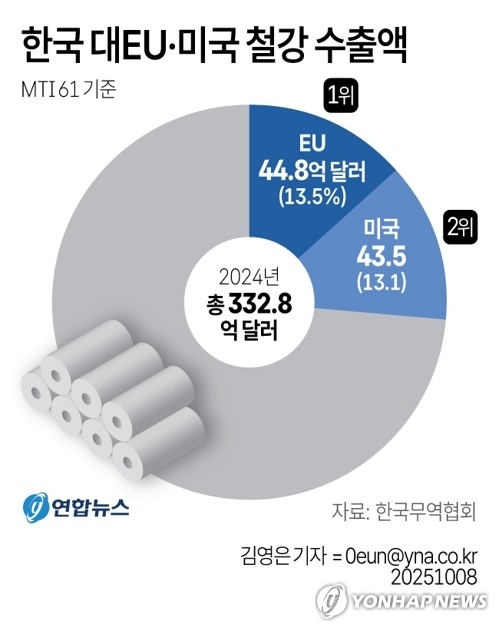한국무역협회에 따르면 작년 한국의 대(對)EU 철강 수출액(MTI 61 기준)은 44억8천만 달러(약 6조 2천836억원)로, 단일국가 기준 1위 수출시장인 미국(43억4천700만 달러)보다 소폭 더 많았다.