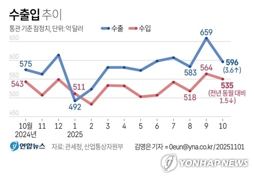 이로써 10월 무역수지는 60억6천만달러 흑자를 기록했다. 1∼10월 누적 흑자 규모는 564억3천만달러로 작년 전체 흑자 규모인 518억4천만달러를 이미 넘어섰다.