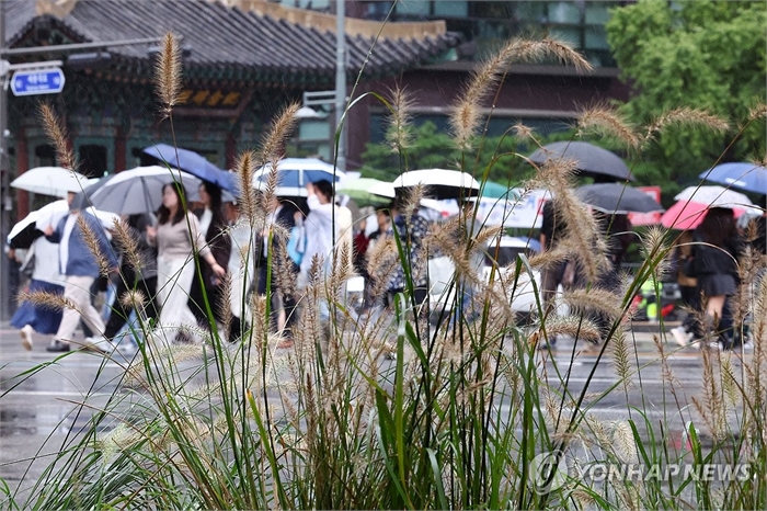 서울 종로구 광화문네거리에서 우산을 쓴 시민들이 길을 건너고 있다. [연합뉴스 제공]