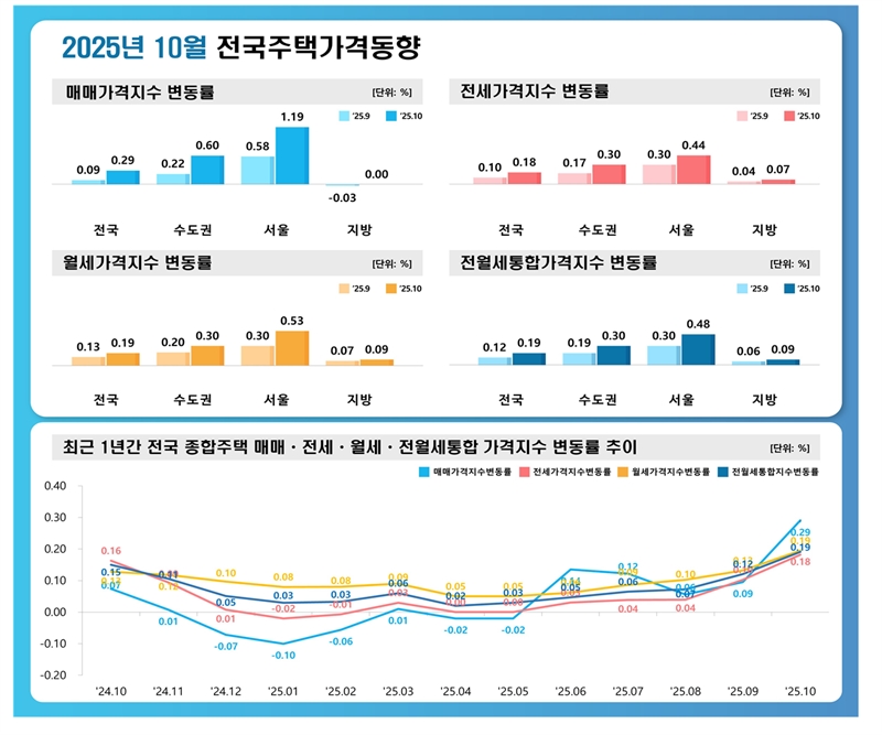 10월 전국 주택시장에서 매매·전세·월세가 모두 상승하는 ‘트리플 상승’이 나타났다. 특히 서울 아파트 매매가격은 1.19% 상승하며 전국 상승세를 주도했다.