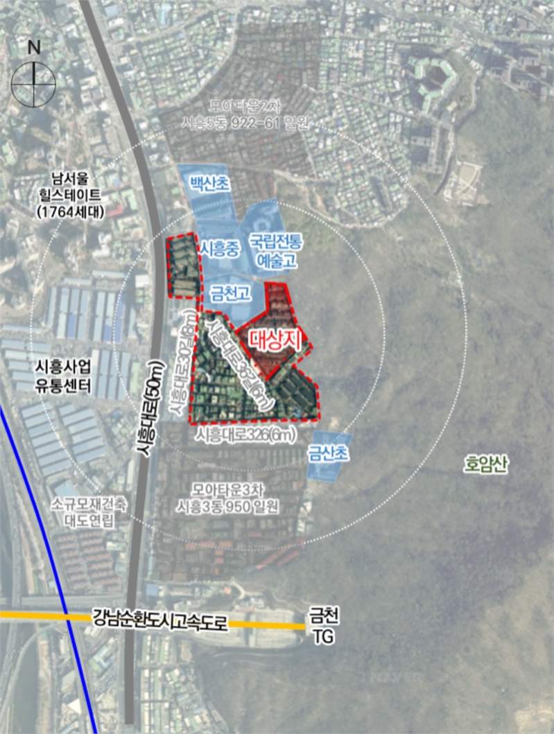 금천구 시흥3동 1005번지 일대는 7개 동·473세대(임대 95세대)로 조성된다. 사업성 강화를 위해 임대주택 20% 이상 건설 시 허용되는 용적률 완화를 적용했고, 인근 시흥동 943 일대 모아주택과의 동시 개발로 구릉지라 재개발이 어려웠던 문제가 해소될 것으로 기대된다.