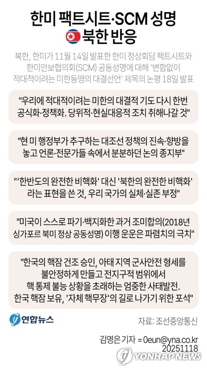 다만 북한은 이번 팩트시트 및 SCM 공동성명에 대한 반응을 당국자 명의의 공식 성명이나 담화가 아닌 조선중앙통신 논평 형식으로 냈고, 트럼프 대통령이나 이재명 대통령을 실명 비난하지 않았다.
