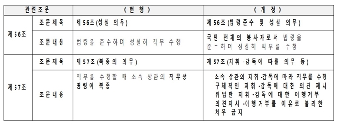 아울러 56조의 '성실의무'를 '법령준수 및 성실의무'로 변경하고, 공무원이 '국민 전체의 봉사자'로서 법령을 준수하며 성실히 직무를 수행해야 한다고 규정했다.