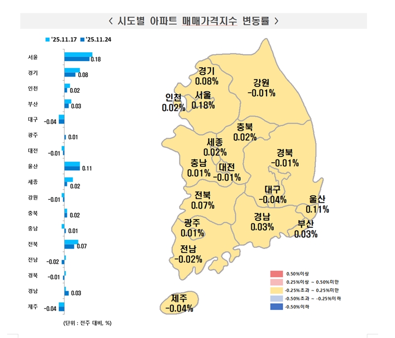 지방 시장은 전체적으로 0.01% 상승해 보합에 가까운 흐름을 보였다. 다만 지역별 온도차는 뚜렷했다. 울산은 0.11% 상승하며 정주여건이 양호한 단지 중심으로 강세를 나타냈고, 부산은 0.03% 상승하며 해운대·수영·동래 등 인기 지역이 상승세를 견인했다. 세종은 0.02%, 전북은 0.07% 상승하며 안정적인 흐름을 이어갔다.