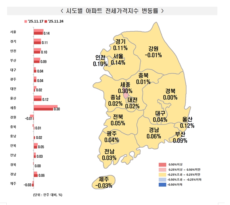 서울 전세가격은 0.14% 상승하며 수도권 전세 상승 흐름을 주도했다.