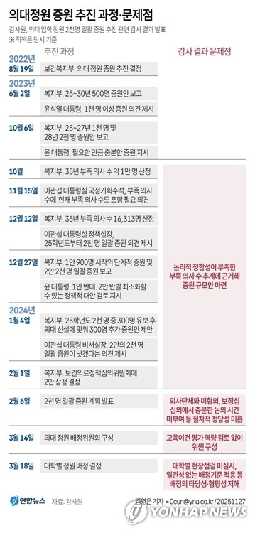 의료대란을 불러왔던 의대 입학 정원 2천명 일괄 증원 추진과 관련해 증원 규모 결정부터 대학별 정원 배정에 이르기까지 전반적으로 문제가 있었다는 감사 결과가 나왔다.