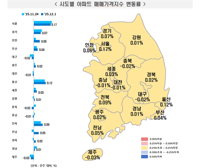 지방 매매가격은 0.02% 상승했다. 5대 광역시 전체가 소폭 상승한 가운데 울산은 0.12% 오르며 지방 상승세를 주도했다. 동구·북구·남구가 모두 두 자릿수 상승률을 기록했다. 부산도 수영구(0.17%), 해운대구(0.16%), 동래구(0.13%) 등 신축·재건축·대단지 중심으로 상승세를 보였다.