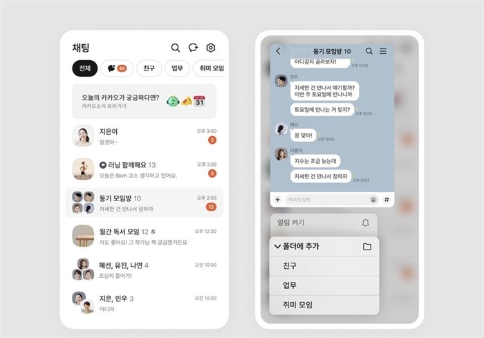 모바일에서 채팅방을 길게 누르거나 PC에서 채팅방 우클릭을 하면 바로 폴더에 채팅방을 추가할 수 있다.