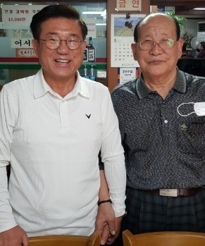 생전의 고인(오른쪽)과 매니저 송동호씨 [송동호 승진완구 대표 제공]