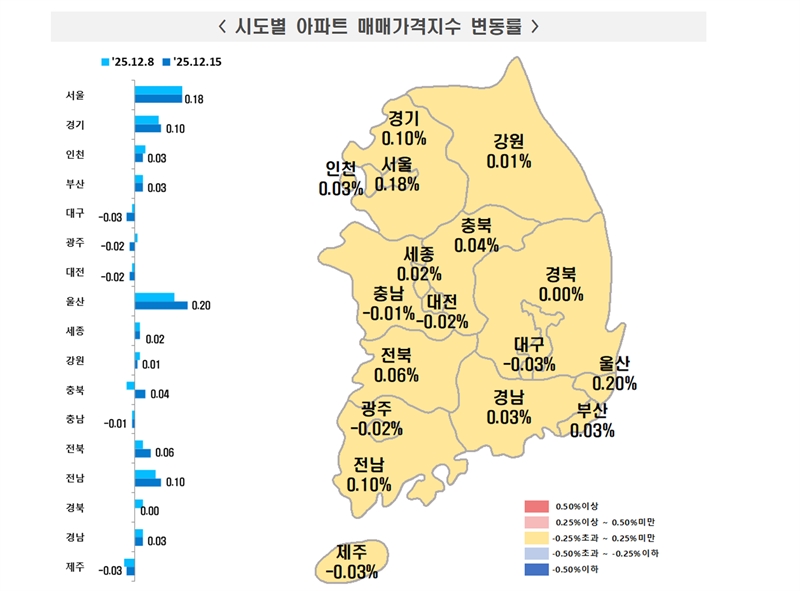 지방 아파트 매매가격은 0.02% 상승했다. 특히 울산은 0.20% 상승하며 5대 광역시 중 가장 높은 상승률을 기록했고, 전남(0.10%)도 상승세가 두드러졌다.