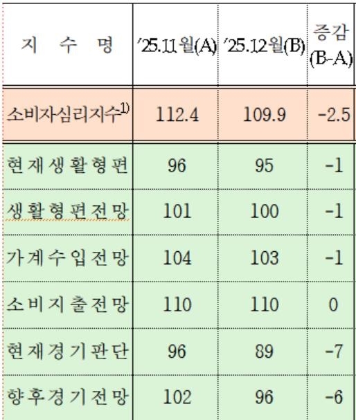 11월과 비교해 CCSI를 구성하는 6개 지수 가운데 현재경기판단(89·-7p) 하락 폭이 가장 컸고, 향후경기전망(96·-6p)·가계수입전망(103·-1p)·생활형편전망(100·-1)·현재생활형편(95·-1p)도 뒷걸음쳤다. 소비지출전망(110)에는 변화가 없었다.