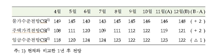 하지만 주택가격전망지수(121)는 2p 올랐다. 10·15 대책 등으로 11월(119) 3p 내린 뒤 한 달 만에 반등했다. 1년 뒤 집값 상승을 점치는 소비자의 비중이 늘었다는 뜻이다.