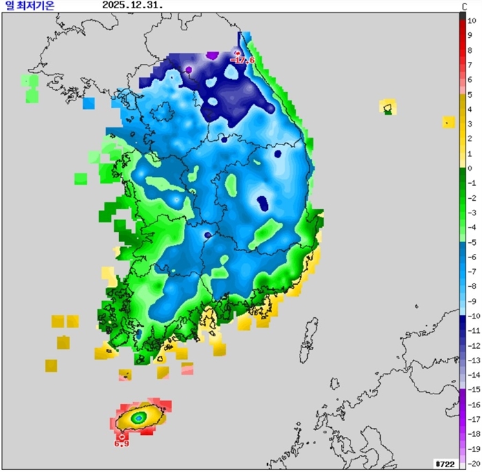 1월 1일 아침 최저기온은 -16∼-4도, 낮 최고기온은 -6∼3도로 예상되며 2일은 -17∼-5도와 -6∼4도겠다.