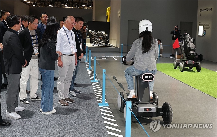 정 회장은 직원들의 설명을 들으며 차세대 모빌리티 로봇 플랫폼 '모베드', 전기차 자동 충전 로봇(ACR) 등을 유심히 지켜봤다.