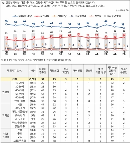 정당별 지지도를 보면 더불어민주당은 39%, 국민의힘은 23%를 각각 기록했다. 지난 조사와 비교해 민주당은 2%p 내렸고, 국민의힘은 3%p 올랐다.