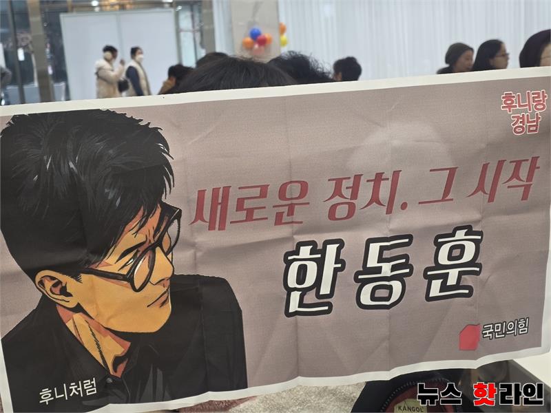 한 여성 지지자가 한동훈 전 대표 지지 피켓을 들고 한동훈 전 대표의 강연을 듣고 있다.