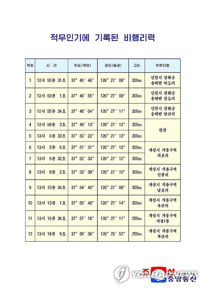북한은 무인기에 기록된 비행경로도 공개했다. 비행이력에는 시간과 위도, 경도, 고도, 주변 지명이 기록돼 있었으며, 무인기가 촬영했다고 주장한 사진에는 개성시 개풍 구역, 황해북도 평산, 개성공업지구 일대 상공 등이 찍혀있었다.