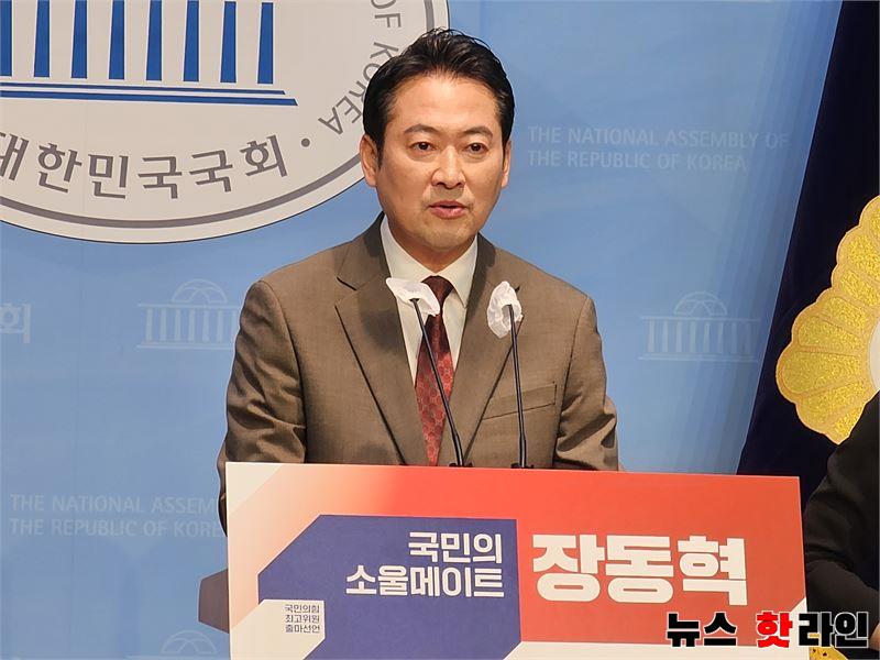 장동혁 의원은 이날 오후 국회 소통관에서 "정치는 위기를 기회로 만드는 일"이라며 "당의 위기를 기회로 만들겠다"고 말했다. 그는 "의석수가 부족한 국민의힘이 절대 다수의 야당과 맞설 수 있는 유일한 방법은 '민심'이라는 창과 방패를 들고 싸우는 것"이라며 "민심에 민감하게 반응하는 정당을 만들겠다. 필요하다면 정부와