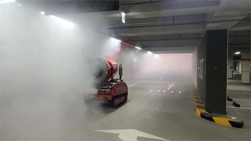 이번 훈련은 지하주차장 전기차 화재를 가정하여 핫 스모크 테스트(Hot Smoke Test)를 통해 연기의 유동을 확인하고 배연 로봇을 활용 연기 배출을 위한 최적의 조건을 검증하는 한편, 지하층과 연결되는 출입구에 연기차단 커튼을 설치하여 연기의 흐름을 막아주는 성능 실험도 병행했다.