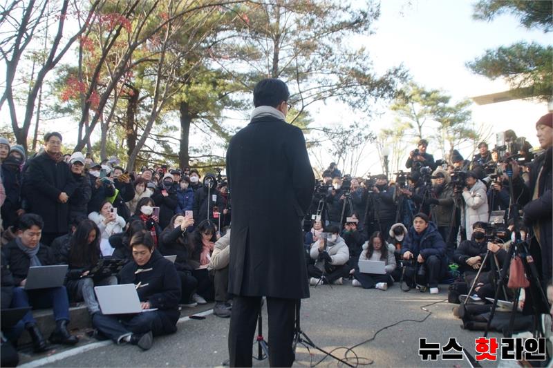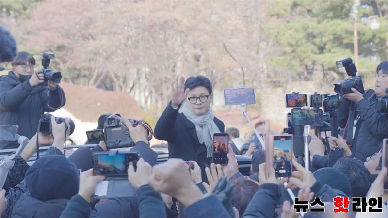 한 전 대표는 이날 오후 서울 여의도 국회도서관 앞 쪽문에서 비상계엄 1년 기자회견을 열고 이같이 말했다. 이곳은 한 전 대표가 계엄 선포 당시 계엄 해제 표결을 이끌기 위해 국회로 진입했던 통로다. 이날 회견에는 일부 친한(친한동훈)계 의원들과 다수 지지자가 참석했다.