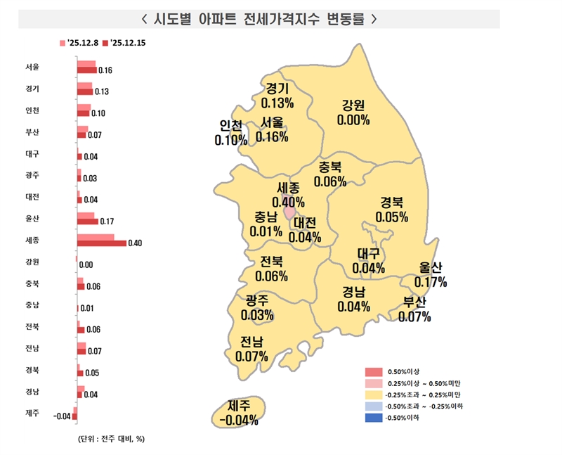세종시는 전세가격이 0.40% 상승하며 전국 최고 상승률을 기록했다.매물 부족 속에 종촌·한솔동 등 선호 단지를 중심으로 임차 수요가 몰린 영향으로 풀이된다.